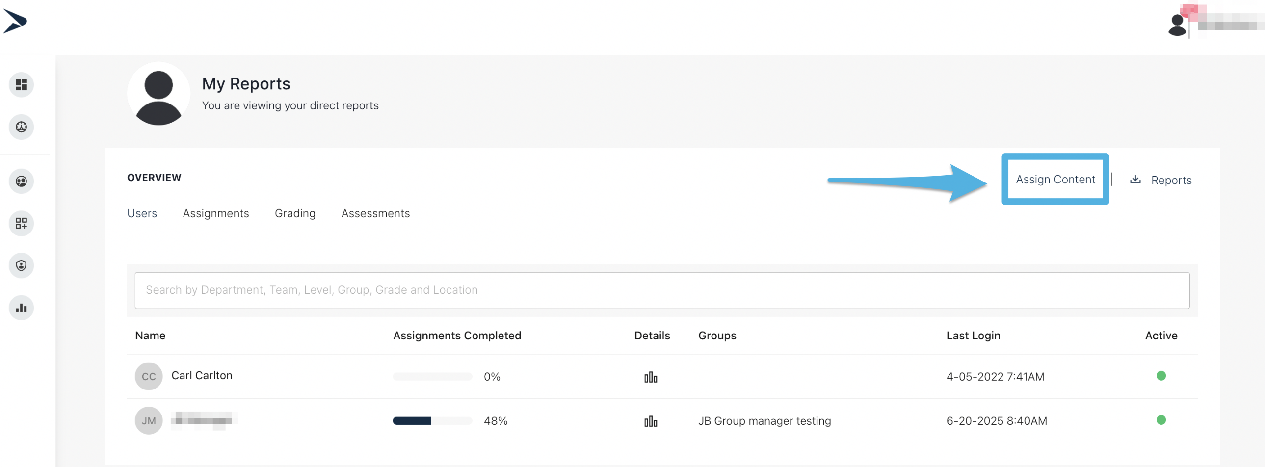 The assignment tab will provide a list of all assignments for the manager's direct reports. This field can be searched by user, segmentation (department, location, etc) or content. In addition, via the Assign Content button (shown below) you can assign content to your direct reports. For more details on this, see Managers: Creating a Direct Assignment