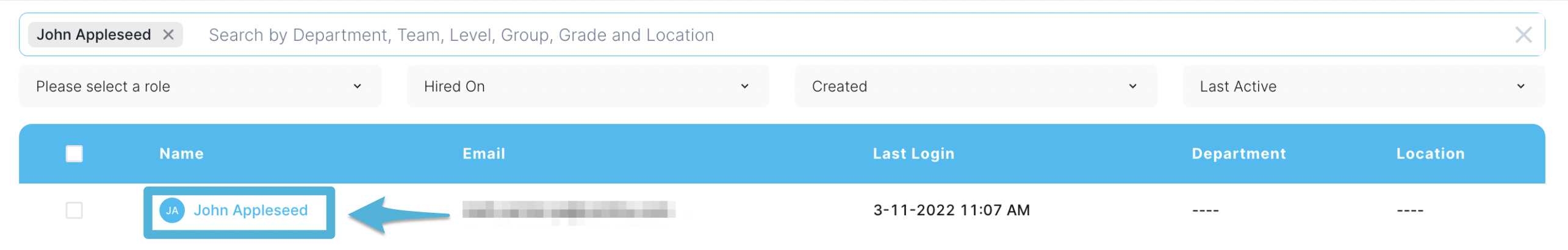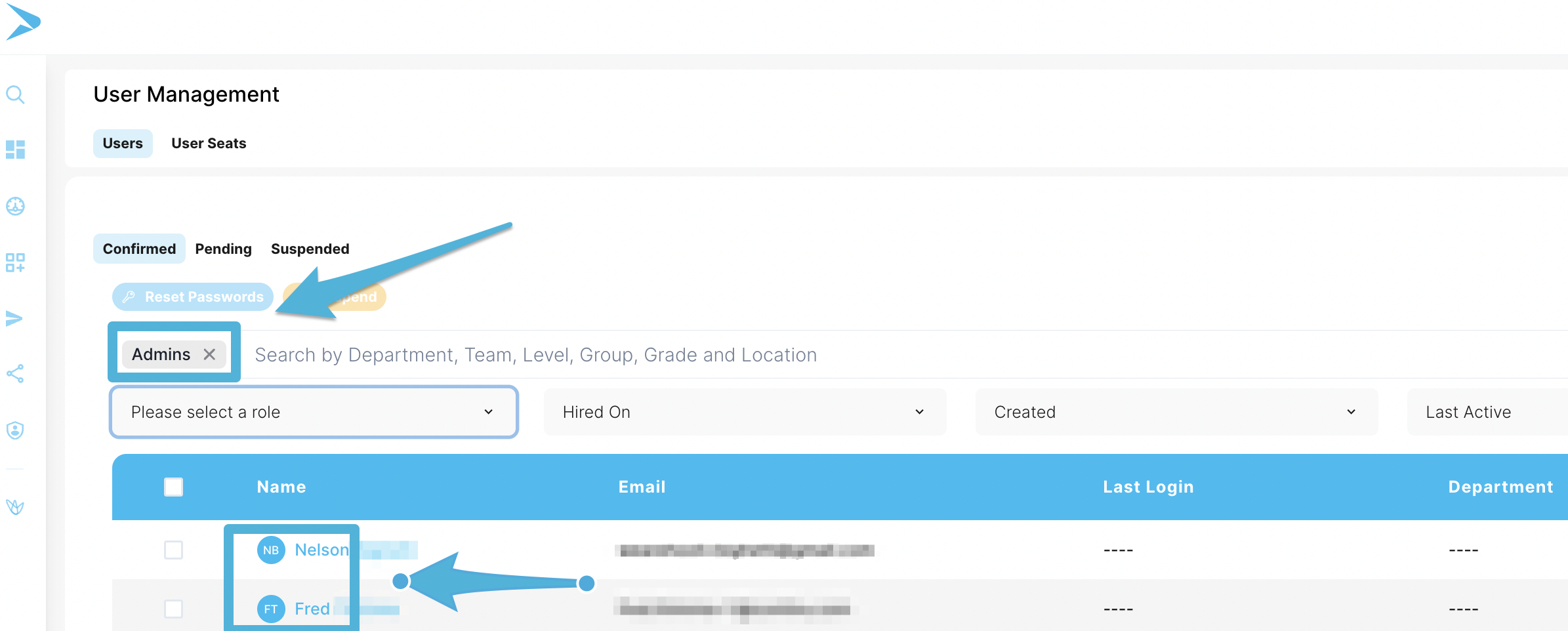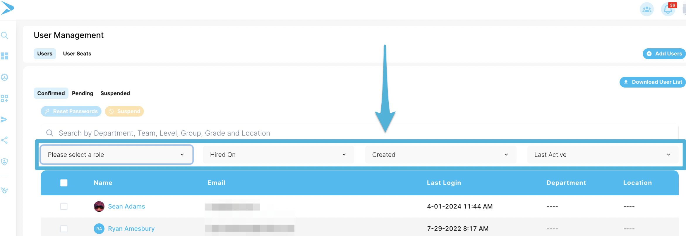 2. Select the filter you'd like to specify Users by. This includes Roles, Hired On dates, Created dates, and when the User was Last Active