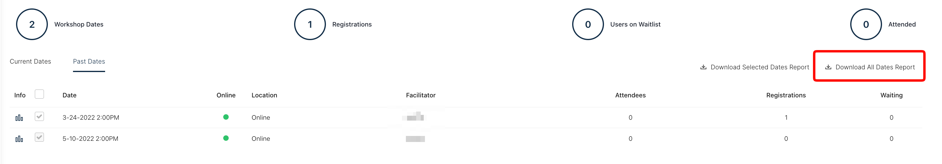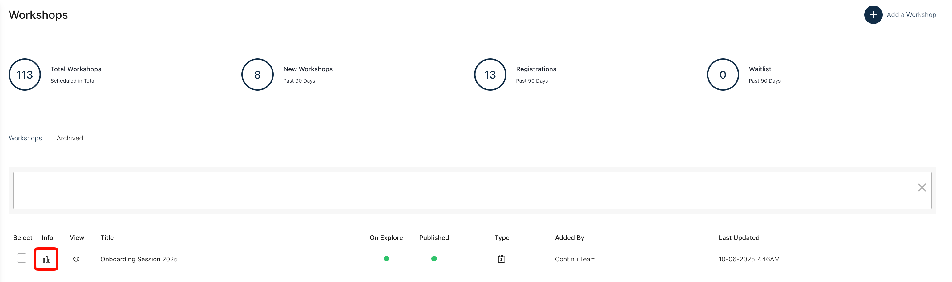 Step 2: Click on the Info icon beside the Workshop that you would like to run a report for