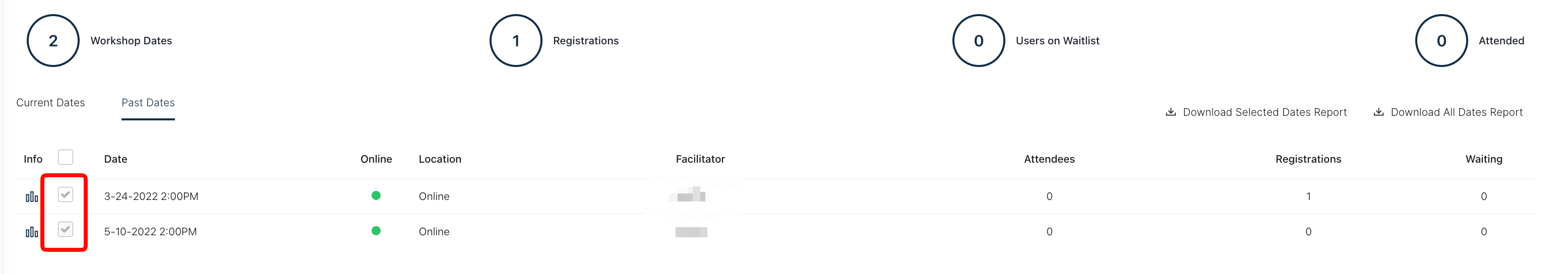 Step 3: Select as few or as many sessions you would like to include in the report by using the checkbox next to each workshop session.